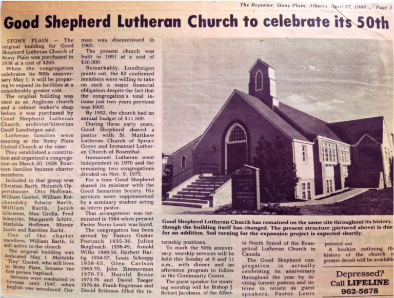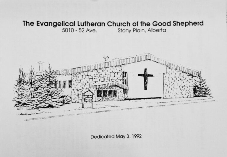 Good Shepherd Lutheran Church was originally built in 1951. An addition was made in 1997 to accommodate a growing congregation. Before our church was made there was Pastor Gustav Poetzsch who served St. Matthew’s, Spruce Grove and Immanuel, Rosenthal from 1915 until 1935. He was approached by members of the Rosenthal church to establish a congregation in the town of Stony Plain. Pastor Poetzsch agreed and began conducting Bible studies and worship services in the homes of member families shortly before he left the parish in 1935. Pastor Julius Bergbusch (1936) continued the work in Stony Plain. Soon attendance increased and it soon became necessary to seek larger worship facilities. A deal was struck with the United Church in Stony Plain whereby the fledgling Lutheran congregation could use the United Church’s facilities for the sum of $1.50 per Sunday. When the desire of having a place of their own the congregation became a legally constituted entity. On March 20, 1938 the meeting was held under the leadership of Pastor Bergbusch and the name, “Evangelische Lutherische Gemeinde zum Guten Hirten” (The Evangelical Lutheran Church of the Good Shepherd) was chosen with a church council elected. It became formally incorporated on May 8, 1938 with a charter membership of 14 families. At the same time the congregation negotiated the purchase of property on 52nd avenue owned by Christian Barth for the sum of $265.00. Mr. Barth, who was using the building as a cabinetmaking shop, had originally bought the property from the St. Oswald’s Anglican Church. The building which was originally dedicated as a house of worship, was once more to be used for that purpose. Many people and churches donated time, skills, money and furnishings. Untold hours of labor were given by the members in an effort to make the little church a fit place of worship. The new congregation became the third church in a three-point parish consisting of St. Matthew’s, Immanuel and Good Shepherd.