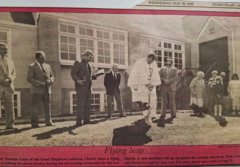 German remained the main “church” language until 1947 when Pastor Bergbusch voiced (and council agreed upon) conducting three worship services a month in English, as well as confirmation instruction. The following year (1948) a possibility of a new and larger church was discussed to accommodate the growing congregation. A committee was made in 1949 to look into what it would take. The exceptional leadership qualities of Pastor Bergbusch was recognized and appreciated, not only from Good Shepherd, but from the Evangelical Lutheran Synod of Western Canada and he was elected as their new president. Next to serve our church was Pastor Wilke, who was the first Canadian-born and Canadian-educated pastor to serve the congregation. He continued with the decision to make room for the growing church and after much planning, budgeting and discussion construction began in the spring of 1951. Among the contractors were 30 men and women from Good Shepherd’s congregation that donated their time to help build. Pastor Wilke attended numerous meetings and appointments and spent many late hours to get everything in order and keep it all going. The old building was bought by United Church and moved to Holborn district until June of 1967 when the Holborn congregation merged with Stony Plain United.