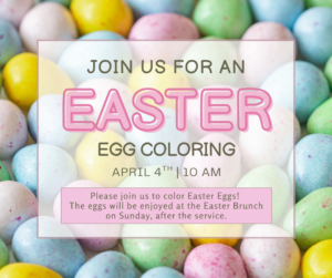 Mom’s, Dad’s, Grandma’s and Grandpa’s bring your kids and grandkids out to color Easter eggs at the church. The colored eggs will be enjoyed at the Easter Brunch! You are also welcome to bring eggs to color that you wish to bring home with you.